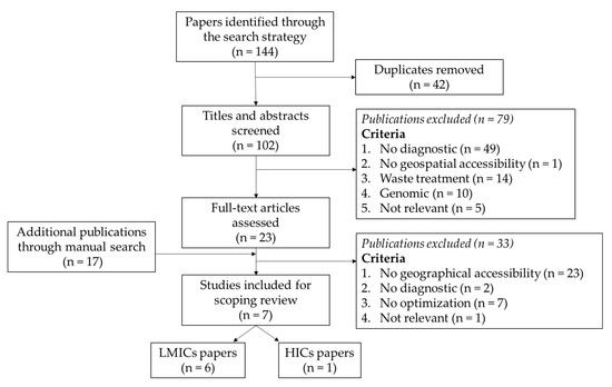 All publications involving assessment or optimization of diagnostics networks through the use of distance- or time-based metrics, or using concepts linked to physical accessibility to the network or population accessibility, were included in the selection process. We targeted journal articles, book chapters, short communications, or presentations written in English. Studies taking place either in high-income or low- and middle-income countries were kept, although at the end of the selection process, these two sets were treated distinctly. All studies that could not be related to at least one diagnostic or that did not use geospatial analyses or optimization strategies were excluded.