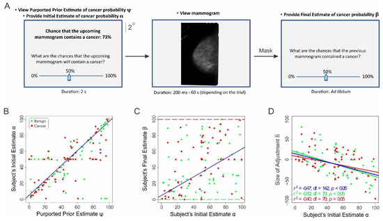 Task paradigm and results from Study 1. (A) Task paradigm. Each trial started with the onset of a central fixation spot, and each mammogram was followed by a 0.5 s random dot mask (not shown). Not drawn to exact scale. (B–D) Results. (B) Subjects’ initial estimate α as a function of the previous radiologist’s estimate ψ. (C) Subjects’ final estimate β as a function of their initial estimate α. The red and green dashed lines denote the expected responses for mammograms positive and negative for cancer, respectively. (D) The amount of the subjects’ adjustment δ as a function of their initial estimate α. The red, green, and blue dashed lines denote the best-fitting regression lines for all the mammograms, mammograms positive for cancer, and mammograms negative for cancer, respectively.