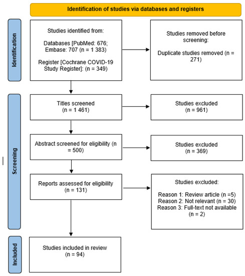 A total of 1732 articles were identified through databases and register searching (Figure 1). Of these, 271 duplicates were identified and removed using data tool in Excel. After screening the titles, 961 articles that were not primary research articles and unrelated to antigen-based detection for COVID-19 were excluded. Of the 500 abstracts screened, 369 articles that did not meet the basis of selection criteria were excluded. After screening the full text articles, 37 articles were excluded. The remaining 94 studies that fulfilled our selection criteria were included in this systematic review.
