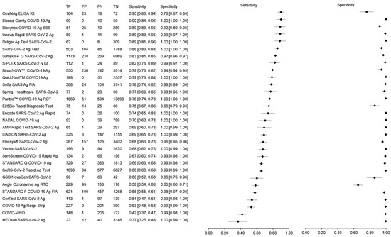 The forest plot of sensitivity and specificity of rapid antigen tests for SARS-CoV-2.