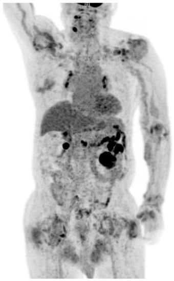 Maximum intensity projection of 18F-FDG PET-CT demonstrated increased metabolic activity in the shoulders, left elbow, left wrist, left hand and hips.
