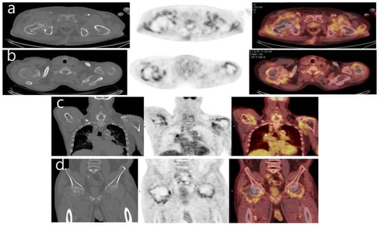 18F-FDG PET-CT axial (a,b) and coronal (c,d) images of both shoulders and hips demonstrate diffuse periarticular uptake. Non-contrast CT obtained in conjunction with PET-CT imaging showed osseous erosions involve both humeral and femoral heads.