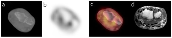 Axial 18F-FDG PET-CT image (a–c) of the left wrist demonstrates periarticular uptake and associated osseous erosions. Axial T1-weighted MR image (d) reconfirms erosion and periarticular hypointense amyloid deposits.