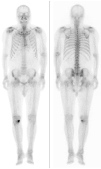 Protein electrophoresis showed no monoclonal gammopathy. Serum kappa was 208.99 mg/L (normal 3.3–19.4 mg/L) and serum Lambda was 195.15 mg/L (5.71–26.3 mg/L) with a normal kappa-to-lambda ratio of 1.05 (normal 0.26–1.65). Serum β2-microglobulin was increased as 19.55 mg/L (normal 1.0–2.4 mg/L). Serum CRP and calcium were normal. Rheumatoid factor and anti-CCP antibodies were negative. No significant myocardial uptake was observed in the bone scan obtained after injection of 99mTc-hydroxymethylene diphosphonate (HDP), which was performed to exclude rheumatoid arthritis due to arthralgia (Figure 4). Eventually, the patient underwent joint aspiration, and cytology revealed the presence of amyloidal deposits. Those findings were compatible with dialysis-related amyloid arthropathy.