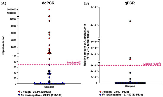 Amount of F. nucleatum in 139 CRC FFPE tumor samples according to each methodology. Dotplots represent samples, and the dotted line represents the median cut-point amount around which samples were classified as having a high (above median) or low/negative (below the median) amount of Fn. (A) The distribution of Fn DNA in copies/reaction detected by ddPCR (median = 69 copies/reaction). (B) The relative amount distribution of Fn DNA was detected by qPCR (median = 6 × 10−6).