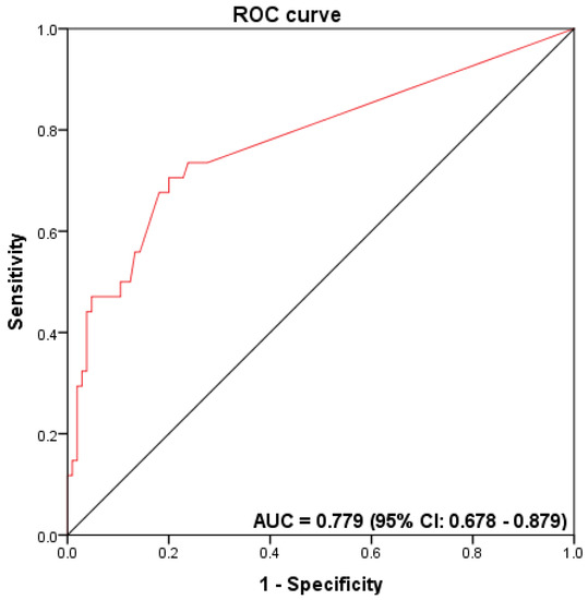 We further evaluated the accuracy of ddPCR and qPCR for Fn DNA detection in FFPE CRC samples, considering the previously reported Fn status obtained by qPCR in fresh-frozen tissue as the gold standard [19]. Fn DNA were detected by qPCR in 24.4% (34/139) of fresh-frozen tumor samples [19]. ROC curves were generated, and the AUC values were determined to describe the accuracy of ddPCR and qPCR for the Fn DNA detection in FFPE CRC samples. The AUC value for Fn detection by ddPCR was 0.779 (95% confidence interval (CI) 0.678–0.879) (Figure 3), with a sensitivity of 70.6% and specificity of 80.0%, a positive predictive value of 53.3%, a negative predictive value of 89.4%, and an accuracy rate of 77.7%. Due to the low number of high-Fn cases identified when testing by qPCR and the ROC curve, the AUC levels could not be determined (Figure S4).
