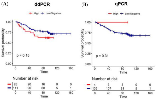 Moreover, we interrogated the impact of Fn on patient survival. Patients who had a high amount of Fn DNA detected by ddPCR had a shorter overall survival when compared to patients with a low/negative amount of Fn DNA, yet it did not reach statistical significance (58.3% vs. 76.8% at five years; log-rank p = 0.15) (Figure 4A). No significance was observed when analyzing Fn DNA by qPCR (60.0% vs. 75.0% at 5 years; log-rank p = 0.31; Figure 4B).