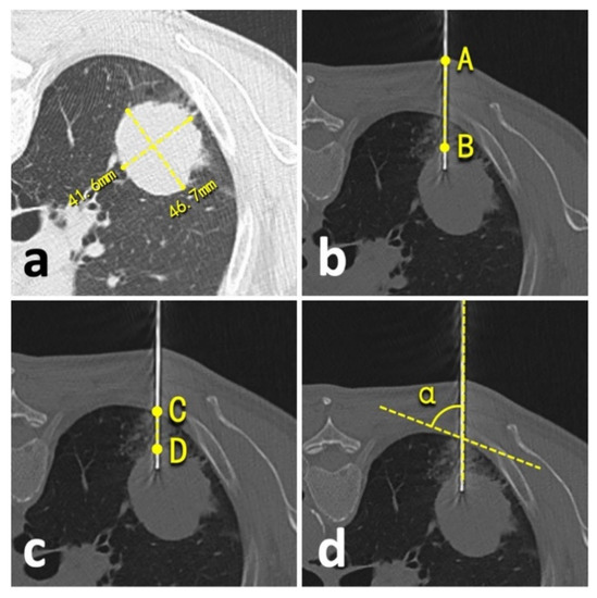 The biopsy-related complications were collected and classified from Grade-A to -E under the standards of the Society of Interventional Radiology [24]. A minor complication was defined as Grade-A or -B complication, and a major complication as Grade-C to -E complication [24]. Besides this, the risk factors of complication were comprehensively explored, including prior emphysema history, patient position during the biopsy, lesion size, needle repositioning, lesion-skin distance along the needle path (from lesion border to skin) (Figure 3b), lesion-pleural distance along the needle path (from lesion border to pleura) (Figure 3c), needle-pleural angle (Figure 3d), and the number of obtained samples [4,5,19,20,23]. Two independent radiologists performed all measurements (LY and YW, with 23- and 2-year experience in thoracic radiology, respectively), and the average of the measurements was involved in the final analysis.