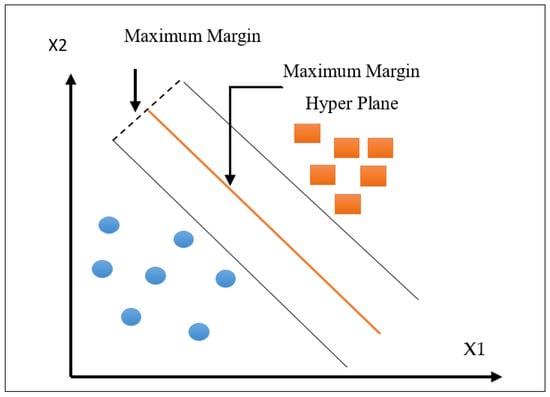 The SVM constructs a separation hyperplane that splits the labeled data into classes and determines whether a new data value belongs above or below the line. There may be several hyperplanes, and the one with the largest margin between data points is chosen. Figure 1 shows the maximum hyperplanes and maximum margin of the support vector machine. The equation of hyperplane that separates two classes is given by: