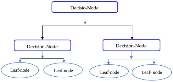 Decision trees are a nonparametric method of supervised learning []. This is a classified structured tree that defines the characteristics of a data set. It represents internal rules for decision-making through internal nodes and tree branches. It has two types of nodes, the decision, and the leaf nodes. The decision nodes take some decisions, and the outcomes of such decisions are leaf nodes. A decision tree has presented in Figure 3.