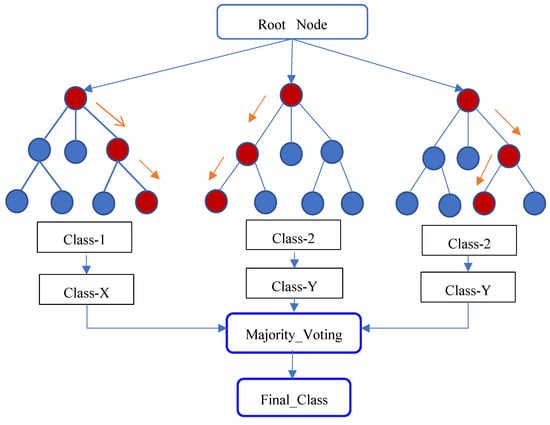The random forest algorithm is based on ensemble learning, improving the model’s performance, and solving complex problems by combining several classifiers. A classifier named after the algorithm that contains multiple decision trees averaged over a database subset to improve predictions. In the forecasting process, it does not rely on a single decision tree, and the random forest algorithm creates forecasts from each decision tree that predicts the conclusion based on the majority of decision votes. The usage of several trees decreases the possibility of the model overfitting. To predict the classes in the database, the algorithm includes many decision trees, some of which can predict the proper outcome while others cannot. As a result, there are two assumptions regarding the prediction’s accuracy. To forecast a more accurate outcome than an estimate, the algorithm must first include the actual value of the feature variable. Second, there must be an extremely low correlation between the forecasts for each tree. As a result, there are two requirements for high forecast accuracy. Figure 4 shows a Random Forest Classifier.