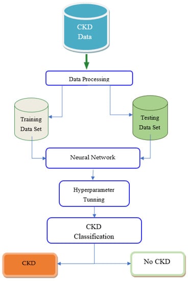 The machine learning technique provides valid decision-making approaches for computer-assisted automatic disease identification []. Machine learning is being used to intelligently interpret available data and transform it into useful knowledge to increase the diagnostic process efficiency []. Machine learning is already being used to assess the state of the human body, analyze disease-related aspects, and diagnose a variety of disorders []. Heart disease has been diagnosed using models based on machine learning techniques []. Diabetes, heart disease, and retinopathy [], acute renal injury [], and cancer [] were all diagnosed using models created by machine learning algorithms. Many researchers have used supervised algorithms, such as Random Forest [], Fuzzy C Means [], Naive Bayes [], Support Vector Machine [,,,], Gradient Boosting [,,,], Logistic Regression [] classifiers in detecting chronic kidney disease. Machine learning can also help to enhance the quality of medical data, reduce the frequency of hospital admissions, and save money on medical expenses. As a result, these models are more commonly utilized in diagnostic analytic research than other older approaches []. The only way to reduce chronic disease (CD) mortality is to diagnose it early and treat it effectively []. The feature extraction and classification processes in traditional machine learning involve two separate methods. As a result, typical machine learning approaches take a long time to compute. Because of this, the traditional technique is no longer viable for real-time diagnostic applications.
