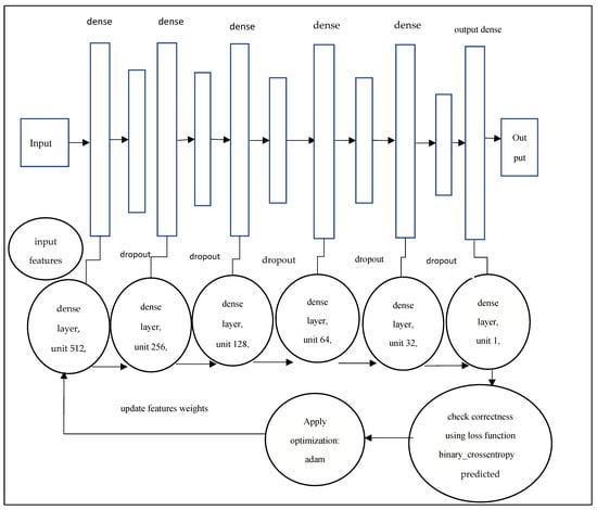 There are 12 layers in the proposed model architecture: an input layer, five dense layers, five drop layers, and an output dense classifier layer. In Figure 7, the layered architecture’s exact specifications are depicted. Each dense layer is connected directly in a feed-forward method in this architecture. The layer is built in such a way that the outputs of its activation maps are handed on to all following levels as input. A dropout layer is placed between two dense layers in this model, with drop rates of 0.5, 0.4, 0.3, 0.2, and 0.1. Figure 7 presents the layered architecture of the proposed model.