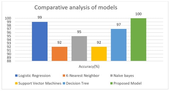 The proposed model outperforms the other classifiers by scoring 100% on all measures. The F1-score, accuracy, precision, and recall of the Logistic regression were all 99%, 99%, 100%, and 98%, respectively. Then Decision Tree obtained an F1-score, Accuracy, Precision, and Recall of 97%, 97%, 95%, and 100%, respectively. The Naïve Bayes F1-score, Accuracy, Precision, and Recall values were 95%, 95%, 92%, and 100%, respectively. The F1-score, Accuracy, Precision, and Recall values of Naïve Bayes were 92%, 92%, 88%, and 98%, respectively. The Support Vector Machines classifier performed the lowest with F1-score, Accuracy, Precision, and Recall values of 92%, 92%, 87%, and 96%, respectively.