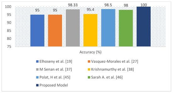 Table 6 compares the proposed model to several recent scholarly studies, such as Ant Colony-based Optimization Classifier by Elhoseny et al. [], Neural network by Vasquez-Morales et al. [], KNN by M Senan et al. [], Convolutional Neural Networks by Krishnamurthy et al. [], SVM by Polat, H. et al. [], and SAE and Softmax Regression proposed by Sarah, A. et al. []. The proposed model has obtained an accuracy of 100%, while the exiting works obtained the accuracy from 85% to 98.5%. Finally, it should be noted that the proposed model is more efficient than existing classification methods.