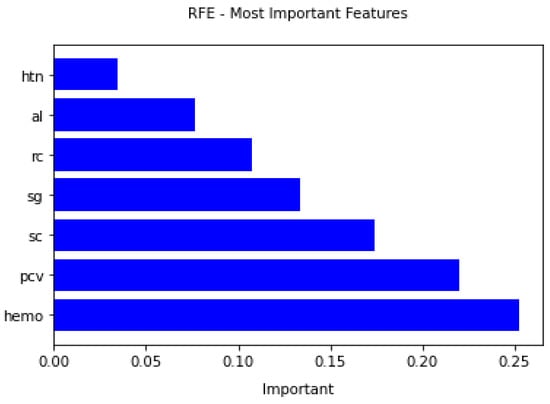 This section of the paper presents the most important feature selected by the RFE algorithm based on their ranking. The figure shows the chosen features and their importance during the classification of CKD disease. The most critical risk factors are Hemoglobin, Serum Creatinine, Specific Gravity, Packed Cell Volume, Red Blood Cell Count, Hypertension, and Albumin, as presented in Table 7. The nephrologists should focus on these risk factors while diagnosing CKD disease patients. Figure 11 shows feature selected by RFE with their importance.