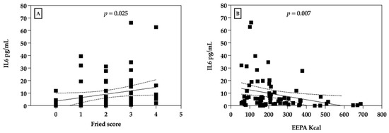 However, there was a significant and positive relationship between the number of fulfilled frailty criteria with IL-6 (r = 0.26; p = 0.025, Spearman) (Figure 1A) and a negative relationship between the specific physical activity criteria (r = −0.31; p = 0.007, Spearman) (Figure 1B).
