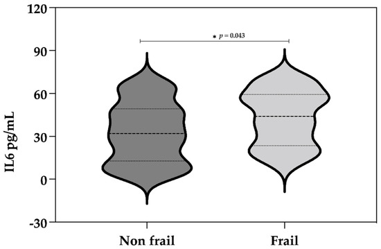 There were significant differences between robust and frail individuals in the concentration of salivary IL-6 (p < 0.043, Mann–Whitney U) (Figure 2).