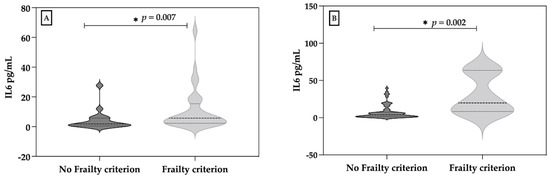 (A) Difference between physical activity frailty criteria and (B) IL-6 (pg/mL) and weight loss frailty criteria and IL-6 (pg/mL).