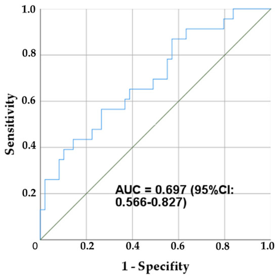 In this study, for IL-6, the area under the curve value was 0.697 with 95% CI (0.566–0.827) (Figure 3), and the cut-off value 3.74 pg/mL has a sensitivity of 69.0% and a specificity of 52.8%. We demonstrated that higher serum IL-6 levels were significantly associated with the higher levels of frail syndrome. Similar results were found for IL-6 serum concentration [9]. As for IL-6, at a concentration > 1.79 pg/mL, there was a sensitivity of 0.68 and specificity of 0.68 for identification of frail patients, but the sensitivity and specificity were not high.)