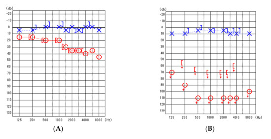 Pure-tone audiometric findings. (A) (left): Preoperative findings. (B) (right): Post-operative findings. Blue, left ear; Red, right ear; blue X, left ear air conduction threshold; red O, right ear air conduction threshold; [ , right ear measured with bone conduction threshold; ] , left ear measured with bone conduction threshold; ↓, scale out .