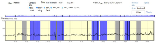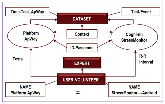 The method of event-related telemetry of the heart rate [24]. The technology provides monitoring and analysis of the dynamics of heart rate variability (HRV) taking into account the event context. The sequence of time intervals between heartbeats (rhythmogram) is recorded with chest plastic electrodes. Primary signal processing and data transmission to a smartphone is performed by the Zephyr HxM ™ Smart Heart Rate Monitor (HxM, Zephyr Technology, New Zealand) via Bluetooth. The specialized Android (4.4 and above) application “Stress monitor” performs the real-time monitoring and transfers data to the cloud server. Rhythmographic visualization, spectral analysis, and detection of stress episodes are implemented in the specialized online-service “Stress Monitor” (cogninn.ru) [5]. The architecture of the event-based telemetry technology is shown in Figure 5.