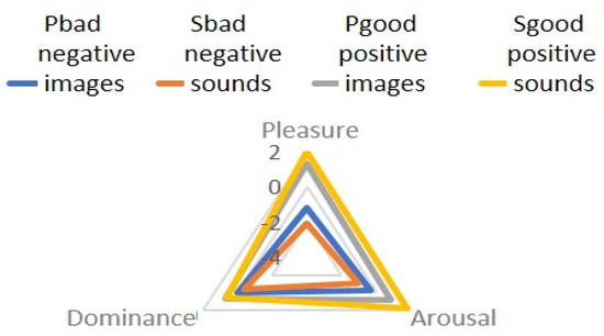 These photos and sounds have a wide variety of tones and scenarios, and represent numerous contexts. The sounds and photos, therefore, are recognizable by subjects from different countries and can trigger similar emotional reactions. To assess the perception of the stimuli by individuals, the authors of the abovementioned databases used the SAM method (Cook III EW, 1987). The advantage of this technique is that it is simple, can be easily used by all subjects, and can even be applied to children. In the original SAM method, emotions are assessed on three scales: (1) by valence (sign),from extremely negative (1-despair, depression) to extremely positive (9-joy, euphoria), (2) by arousal (somatic)-from relaxed (1) to active (9), and (3) by the ability to control emotion-from complete lack of control (1) to complete control (9). The data were labeled on a large sample based on the assessments of the subjects.