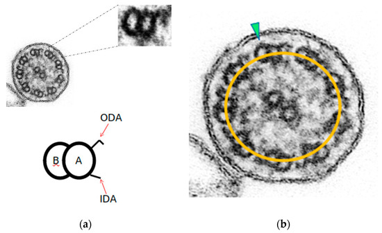 Axonemal symmetry break: (a) rotating doublets of ciliary section without apparent axonemal defects; (b) rotating doublets of ciliary section with absence of ODAs. B-tubules (green arrowheads) are outside the axonemal circumference (red line) (micrographs, original magnification ×530,000).