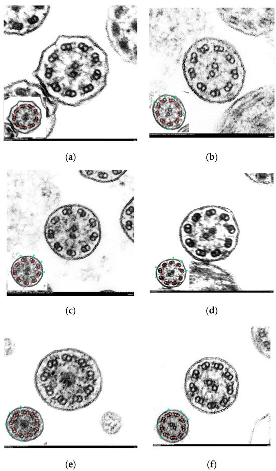 We define the axonemal circumference—or oval—as the line joining the center of all the A-tubules (Figure 1b). In ciliary sections with preserved axonemal structure, the doublets are aligned with their axonemal circumference, and few of them show a slight inclination. These ciliary sections show axonemal symmetry.
