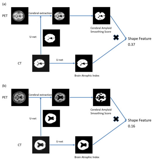 Automatic quantification of beta-amyloid deposition in the brain and brain atrophy was performed using shape feature, which was calculated using the following formula
