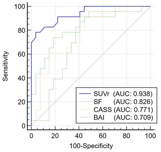 The usefulness of the four parameters (SUVr, shape feature, CASS, and BAI) in the diagnosis of AD is illustrated by ROC curves (Figure 3 and Table 2). The ROC curves of SUVr and shape feature were not significantly different (p = 0.067). Thus, shape feature can be considered equivalent to SUVr. In contrast, there was a significant difference between SUVr and CASS (p = 0.014). SUVr was found to be a better parameter than CASS. There was also a significant difference between SUVr and BAI (p = 0.007), with SUVr determined to be a better parameter than BAI.