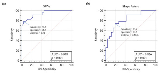 ROC analysis showed that the optimal SUVr cut-off value was 1.31 (sensitivity, 78.3; specificity, 96.3; p < 0.001) (Figure 4a). The optimal shape feature cut-off value was 0.238 (sensitivity, 73.9; specificity, 81.5; p < 0.001) (Figure 4b).