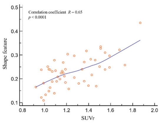 Figure 5 shows the correlation between SUVr and shape feature. SUVr and shape feature showed significant results, with a positive correlation coefficient of 0.65 (R = 0.65; p < 0.0001).