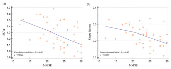 SUVr and shape feature distributions according to the MMSE. (a) There was a significant correlation between SUVr and MMSE (R = −0.45; p = 0.0022). (b) There was a significant correlation between shape feature and MMSE (R = −0.42; p = 0.0050). Abbreviations: SUV, standardized uptake value; SUVr, average region-based SUV; MMSE, mini-mental state examination.