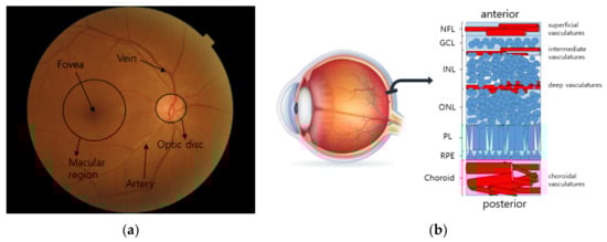 The human eye is an organ that takes in visual information in the form of focused light through light-sensitive tissues. When the light reaches photoreceptors that respond to particular spectral regions, the sensed information is converted to electrical signals, and they are transmitted via nerve fibers to the visual cortex of the brain. The signals are then interpreted as visual images in the brain. As depicted in Figure 1a, the eye consists of important biological landmarks. The macula is the central region of the imaging area, where the photoreceptors are highly concentrated for maximum resolving power. The fovea is located in the center of the macular region, and it is responsible for high-acuity central vision. The optic disc, also called the optic nerve head (ONH), is the circular-shaped area on the ocular fundus, and the place where nerve fibers come together to travel to the visual cortex. The retinal vasculature extends from the optic disc and branches out to the retinal layers. As can be seen in Figure 1b, the retinal layers can be divided into seven layers according to the types of cells [41]. The retinal veins can be classified according to their positions. The superficial, intermediate, and deep retinal vessels are located in the nerve fiber layer and along the sides of the inner nuclear layers. The choroidal vessels are located beneath the retinal pigment epithelium (RPE) and Bruch’s membrane. These vessels supply nutrients and oxygen to the photoreceptors [26]. The blood vessels, including the arteries and veins, are well represented in fundus photography with the reflected spectral ranges of red.