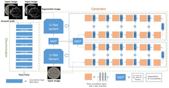 To extract the necessary information from a fundus image, CNN variants were adopted in most of the research on blood segmentation. According to [42,43], RF was used after feature extraction through a CNN. The RF is a non-parametric supervised learner for the final classification of vessels. It was operated after the CNN operation used inputs of the concatenated final features or all the intermediate features that came from the hidden layers of the CNN. Another way to use hierarchical outcomes is to implement an RNN to analyze the global context [44,45,46]. To overcome the shortcomings of CNNs that cannot consider non-local pixel correlations, architectures were modified with skip connection, arithmetic operation, and concatenation [47,48,49,50]. Meanwhile, one widely used deep learning architecture is GAN, which consists of two main parts: generator and discriminator. It is also used for this task, and a recent work achieved good sensitivity with the widely used public datasets DRIVE and STARE [51]. Before feeding the fundus images into the designed network, pre-processing called automatic color equalization (ACE) is performed to enhance the vessels in the image [52]. After that, the image goes into the proposed architecture called M-GAN, as shown in Figure 3. The M-GAN follows the basic shape of the GAN. The generator is made of two consecutive U-Nets that have skip connections with element-wise additions to reflect the global context at each level. The multi-kernel pooling block is located between the two U-Nets to improve the segmentation accuracy. The M-GAN loss function is described in the following equations.