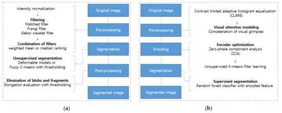 Pipelines of the conventional machine learning methods used for vessel segmentation in [54,55]: (a) In [54], three different filters are used for rough segmentation. The deformable models and FCM are used for sophisticated segmentation; (b) In [55], combined patches of visual glimpses are encoded with the ZCA and k-means filter. The segmentation is done by the RF classifier with encoded features.