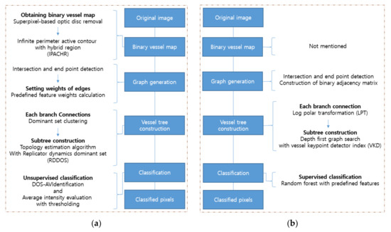 Pipelines of the conventional machine learning methods used for the vessel classification in [73,74]: (a) In [73], after the graph generation by the weight calculation with intersection and end point detection, the subtree construction is followed by branch connections. Finally, the classification is done by DOS-AV Identification; (b) In [74], the adjacency matrix is constructed during the graph generation, and LPT and VKD are used for vessel tree construction. In the last step, the vessels are classified through the RF with the predefined features.