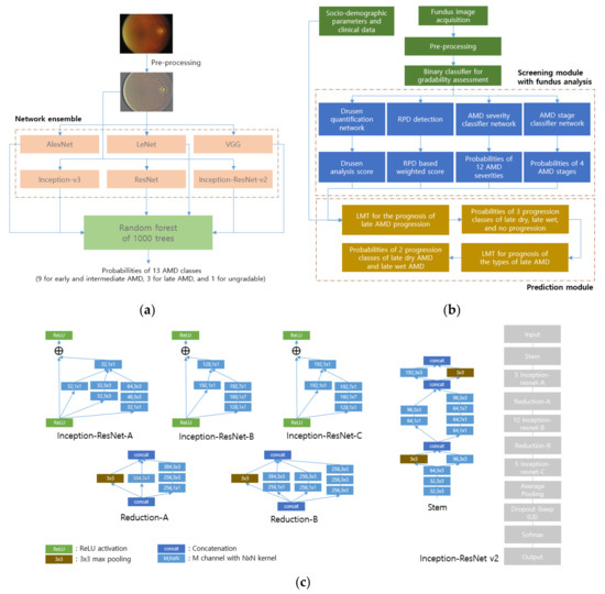 Workflows in [105,106], and one of the used architectures in [105]: (a) In [105], an ensemble of 6 different neural networks is used for feature extraction, and the RF is used for the classification of 13 AMD stages; (b) In [106], AMD classification as well as fundus analysis with Drusen quantification and RPD detection are conducted in the screening module. Based on the classification, fundus analysis, and additional socio-demographic parameters with clinical data, further prognosis of late AMD is done by the prediction module; (c) This shows the architecture of Inception-ResNet v2, one of the six different architectures in [105]. The architecture has six different modules namely, Inception-ResNet-A, Inception-ResNet-B, Inception-ResNet-C, Reduction-A, Reduction-B, and Stem. After analyzing the features by the modules, the Average Pooling and Dropout extract the core information, and the final Softmax layer outputs the probabilities of the classes.
