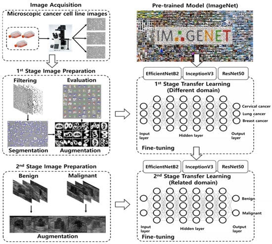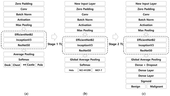 Given a source domain, , and learning task, , a target domain, , and learning task, , transfer learning aims to help improve the learning of the target function, , in using the knowledge in and [28]. This definition is used for a single-step transfer learning algorithm. However, in our case, we performed two-step transfer learning. The first-stage transfer learning involves a model trained on ImageNet (natural images) transfer-learned to classify cancer cell images. At this stage, we are interested only in changing the natural domain to the microscopic image domain. Assume that we have training samples in the ImageNet dataset where is the ith input and is the corresponding label. The first-stage transfer learning takes the weights from the ImageNet pre-trained model and produces by minimizing the cross-entropy objective function in (1) [29].