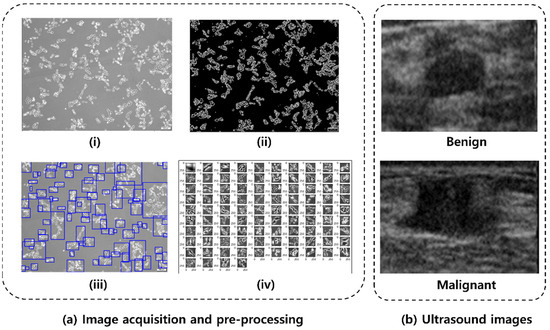 (a) Cancer cell images acquisition and pre-processing: (i) acquired HeLa cell image, (ii) binary image, (iii) image segmentation, and (iv) extracted image for training. (b) Representative Mendeley breast ultrasound images.