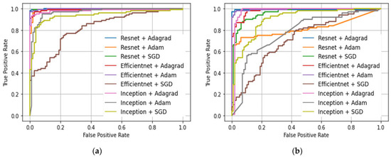 ROC curves comparison. (a) Multistage transfer learning. (b) Conventional transfer learning. SGD: Stochastic gradient descent.