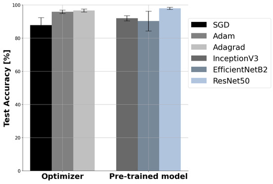 Figure 5(Left) shows that optimizer choice affects performance. Among the three optimizers (SGD, Adam, and Adagrad) used, Adagrad is the best optimizer in MSTL for the classification of breast ultrasound images, with the highest average accuracy of 96.67 ± 1.8%, followed by Adam, with average accuracy of 95.83 ± 2%, whereas SGD is the least best, with average accuracy of 87.83 ± 8.9%. This might be due to Adagrad’s performance superiority for sparse datasets and datasets with missing samples, which is true in our case where a small dataset size was utilized. Even though SGD is fast and simple, it gets stuck at a local minimum, whereas Adam is well suited for big datasets [38]. Based on evaluations carried out, the use of different CNN models resulted in different performances. ResNet50 outperformed InceptionV3 and EfficientNetB2 models in terms of almost all of the performance measures used in this study, as depicted in Table 1. Figure 5(Right) describes the effect of CNN model choice on performance in terms of accuracy, where ResNet50 has the highest accuracy with the lowest standard deviation (98 ± 1%) compared to the InceptionV3 (92 ± 3.1%) and EfficientNetB2 (90.3 ± 9.7%) models.
