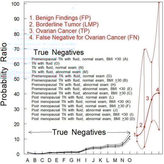 The PRs for women with benign findings (identified by red font “1”) or women with tumors of an LMP (identified by red font “2”) were not significantly different (p > 0.05) from women who were TN for ovarian cancer (Figure 1, black data points). The PR for fluid in women who were TP for ovarian cancer (Figure 1 identified by red font “3”) was much higher and statistically different (p < 0.001) from any category of women who were TN for ovarian cancer (Figure 1, black data points). The PR for fluid in women who were designated FN by TVS alone (Figure 1 identified by red font “4”) was also much higher and statistically different (p < 0.001) from any category of women who were TN for ovarian cancer while not significantly different (p > 0.05) from women with fluid who were TP for ovarian cancer (Figure 1 identified by red font “3”). This observation indicates that the presence of fluid may be an indicator of malignancy that should be followed further by serial TVS of shorter time intervals.