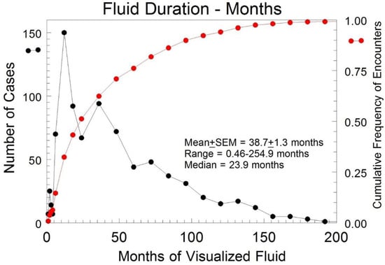 In TN cases where pelvic fluid was present for more than one TVS exam (n = 843), fluid persisted for a mean of 38.7 months (SEM: ± 1.3 months) (Figure 3). The median duration until fluid resolution in the subset of subjects with two or more encounters was 23.9 months, indicating a skew to the left for the distribution of duration.