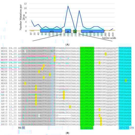 Mutation spectra of the SARS-CoV-2 nucleocapsid protein in the Russian isolates. (A) AA mutation distribution per 20 aa in amino acid strains through the N protein. (B) Local alignment of the SR-rich and linker region of the N protein with mutation mapping. NTD, N-terminal RNA binding domain; SR, serine/arginine-rich domain; CTD, C-terminal dimerization domain; Tc-epitope, predictive T-cell epitope. Nonsynonymous mutations are highlighted in yellow; synonymous mutations are highlighted in white.