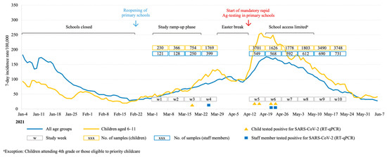 Descriptive data are shown as median/mean, range and interquartile ranges (IQR) for continuous variables. Categorical variables are displayed as total and relative frequencies. The incidence in children and staff was compared using Fisher’s exact test. Positive results were graphically displayed in relation to time, 7-day incidence rates in the general population in the City of Munich and in the age group of 6 to 11 years. In addition, the distribution of specific SARS-CoV-2 variants during the study period was graphically displayed. Analyses were based on proprietary surveillance data by the Bavarian Health and Food Safety Authority. Calculations were performed in RStudio software, version 4.0.2, Python, version 3.7. and Excel 2016. Surveillance data was analyzed using SurvNet@RKI (German notification software; www.rki.de, last accessed on 21 December 2021).