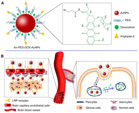 - Ruan, S.; Yuan, M.; Zhang, L.; Hu, G.; Chen, J.; Cun, X.; Zhang, Q.; Yang, Y.; He, Q.; Gao, H. Tumor microenvironment sensitive doxorubicin delivery and release to glioma using angiopep-2 decorated gold nanoparticles. Biomaterials 2015, 37, 425–435. [Google Scholar] [CrossRef]