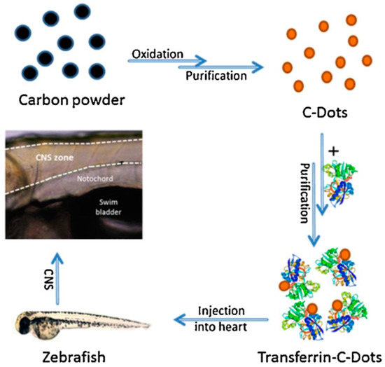 - Li, S.; Peng, Z.; Dallman, J.; Baker, J.; Othman, A.M.; Blackwelder, P.L.; Leblanc, R.M. Crossing the blood-brain-barrier with transferrin conjugated carbon dots: A zebrafish model study. Colloids Surf. B Biointerfaces 2016, 145, 251–256. [Google Scholar] [CrossRef]
