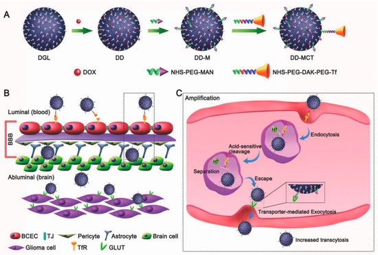 - Ruan, S.; Qin, L.; Xiao, W.; Hu, C.; Zhou, Y.; Wang, R.; Sun, X.; Yu, W.; He, Q.; Gao, H. Acid-Responsive Transferrin Dissociation and GLUT Mediated Exocytosis for Increased Blood–Brain Barrier Transcytosis and Programmed Glioma Targeting Delivery. Adv. Funct. Mater. 2018, 28, 1802227. [Google Scholar] [CrossRef]